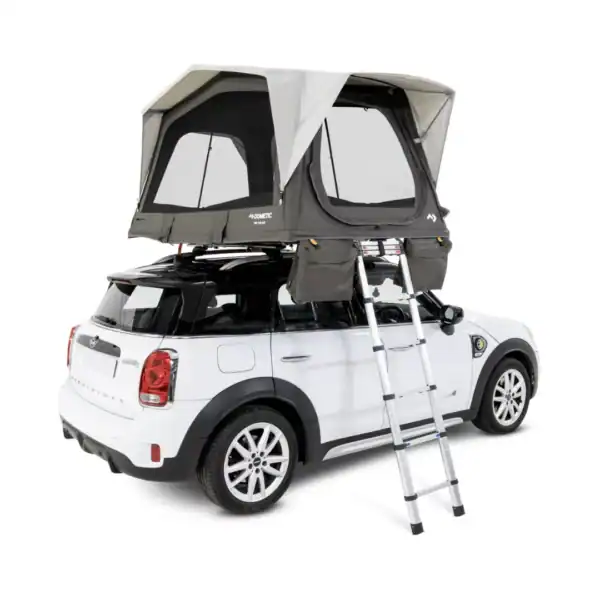 De tent wordt geleverd met een telescopische aluminium ladder, een geïntegreerd schuimmatras van 3,2 cm dik, een anticondensmat en een robuuste PVC-hoes voor transport. Ingepakt is de tent verrassend compact, dankzij het slimme 3-slag ontwerp – ideaal voor gebruik op kleinere voertuigen.